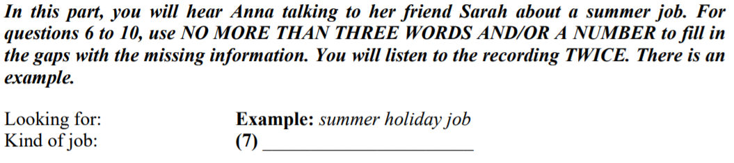 Các câu hỏi phần này giống với Part 2 bài thi Listening của A2 Flyers. Lưu ý: Ở phần này, học sinh cần chú ý đến các lỗi chính tả khi mình phải tự điền đáp án trả lời. |