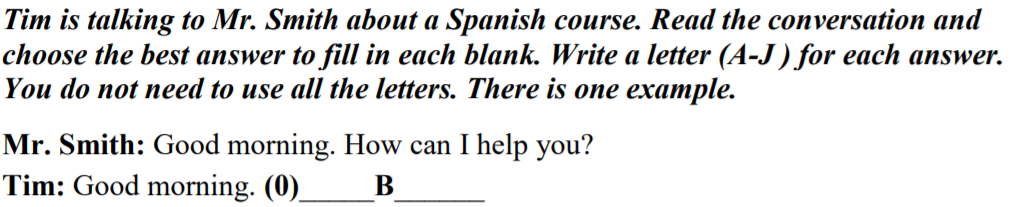 Các câu hỏi nhằm đánh giá khả năng nghe hiểu của thí sinh với những cụm từ và cách diễn đạt về các chủ đề hàng ngày, quen thuộc (về bản thân, gia đình, nơi ở, học tập ...). Học sinh cần hiểu được các thông tin chính, thông tin chi tiết trong các lời thoại được diễn đạt chậm và rõ ràng.
