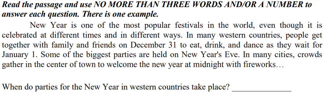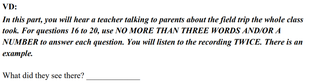 Phần 4. Listen and choose the correct answer (5 câu) Nghe 01 đoạn hội thoại/độc thoại và trả lời 05 câu hỏi bằng cách viết KHÔNG QUÁ 03 TỪ VÀ/HOẶC 01 SỐ. Câu hỏi mẫu: