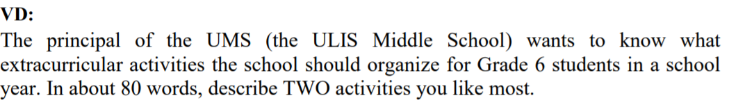 Phần thi này nhằm đánh giá khả năng viết đoạn văn của học sinh trước những chủ đề quen thuộc trong đời sống hàng ngày. Học sinh có thể tham khảo các chủ đề viết có trong các đề thi thử vào lớp 6 THCS Ngoại ngữ và THCS&THPT Nguyễn Tất Thành. |