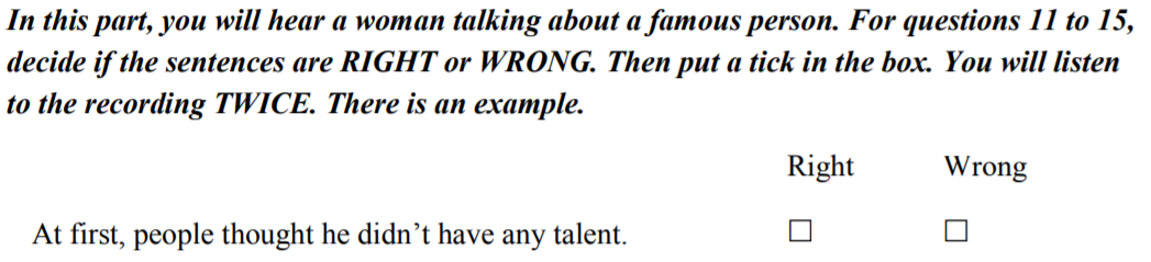 Các câu hỏi phần này giống với Part 4 bài thi Listening của Cambridge PET. Để ôn luyện dạng bài này, HS có thể luyện dạng bài Nghe một đoạn độc thoại/hội thoại và xác định thông tin đúng hay sai trong Cambridge PET. |