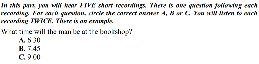 Nghe 05 đoạn hội thoại/độc thoại ngắn, và trả lời câu hỏi trắc nghiệm với 03 phương án cho sẵn. Câu hỏi mẫu: