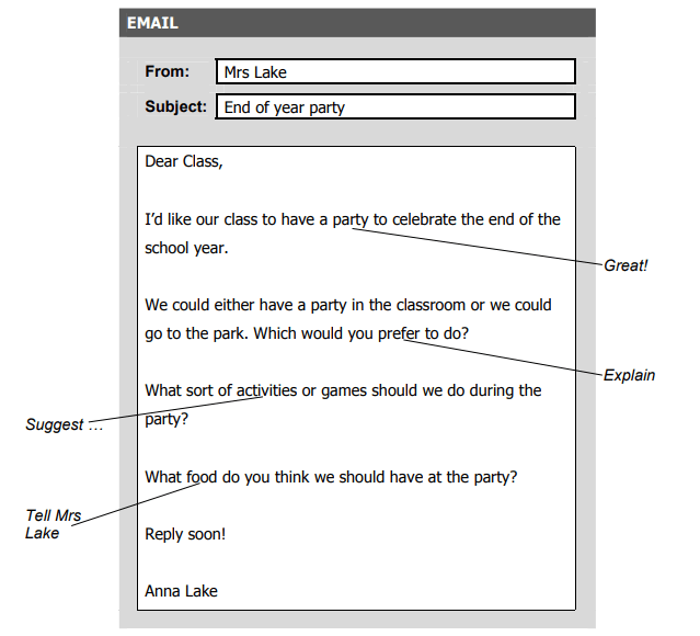 Trong bài thi Writing PET Part 1, đề bài sẽ cho thí sinh một email (thường là email đánh giá, thông báo, lời mời,...) và 04 gợi ý được liệt kê dưới dạng ghi chú trong email. Nhiệm vụ của thí sinh đó là viết một đoạn email để trả lời email trong đề bài, sử dụng tất cả 04 gợi ý đã cho với độ dài khoảng 100-120 từ. Tổng số điểm của Writing PET Part 1 là 20 điểm.