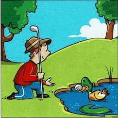 Dịch: Một ngày nọ, William quyết định chơi gôn với ông của mình. Nhưng khi cậu đánh quả bóng với lực rất mạnh, nó đã rơi xuống một cái ao. Một chú vịt thân thiện đã nhìn thấy quả bóng và đẩy nó lại cho William. Cậu bé rất hài lòng.