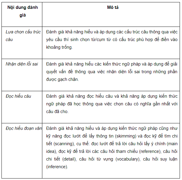 Đề thi tiếng Anh được thiết kế để đánh giá khả năng sử dụng tiếng Anh tổng quát ở cấp độ A2-B1 theo khung năng lực ngoại ngữ 6 bậc, thông qua các nội dung: