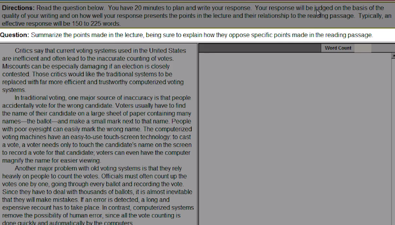 Đọc một đoạn văn ngắn trong vòng 3 phút (230 đến 300 từ). Sau đó nghe một bài giảng ngắn có cùng chủ đề với bài đọc trong vòng 2 phút. Viết một đoạn tóm tắt về những gì bạn nghe được liên quan đến bài đọc.