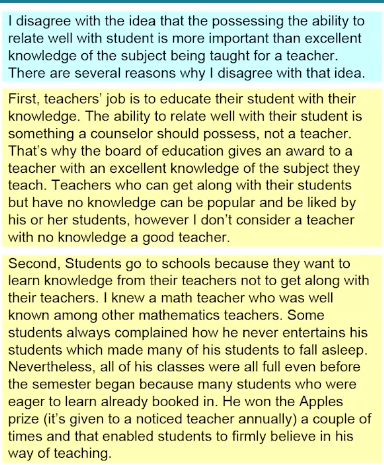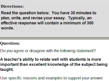 Đòi hỏi thí sinh nêu lên suy nghĩ bản thân về một chủ đề chung, hoặc chủ đề được ưa thích. Thí sinh phải đưa ra những lí do và ví dụ cụ thể để biểu đạt ý kiến của mình.