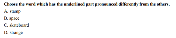 Phần 2: Phát âm (05 câu) Chọn 01 trong 04 phương án có phần gạch chân được phát âm khác. Câu hỏi mẫu: