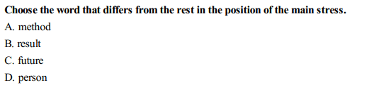 Phần 1: Trọng âm (05 câu) Chọn 01 trong 04 phương án có trọng âm khác với với các từ còn lại. Câu hỏi mẫu: