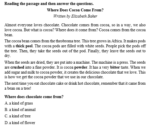 Phần 5: Đọc văn bản và trả lời câu hỏi trắc nghiệm (05 câu) Chọn 01 trong 04 phương án có sẵn để trả lời câu hỏi. Câu hỏi mẫu: