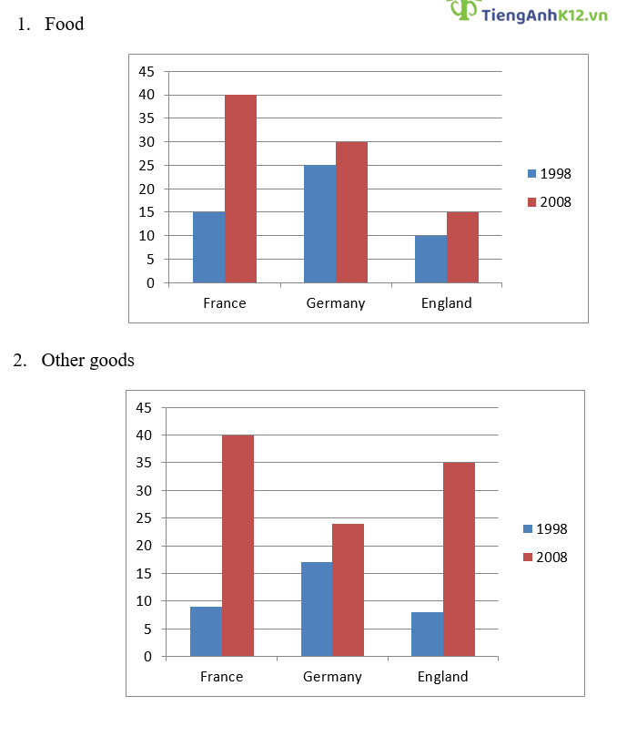Đề bài: The charts show the percentage of income spent on food and other goods in 3 European countries from 1998 – 2008.