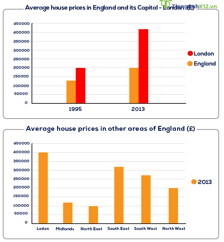 The bar charts illustrate how much an average house costs in England and its capital city – London, as well as comparing the average house prices between different areas of England.
