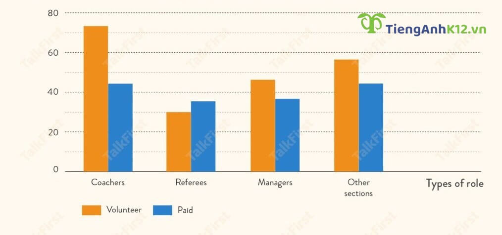Đề bài: The bar chart shows the information of the number of volunteers and paid workers in 4 different roles in the sports sector of an Australian town in 2015.