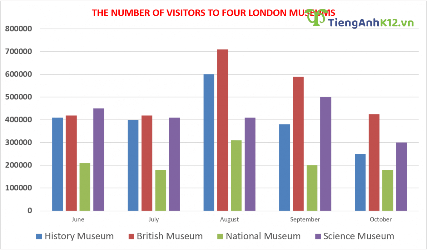 Đề bài: The bar chart below shows the number of visitors to four London museums. Summarize the information by selecting and reporting the main features, and make comparisons where relevant.