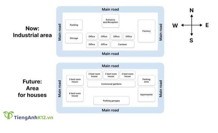 Đề bài: The maps show how an industrial area will change into a housing area in the future