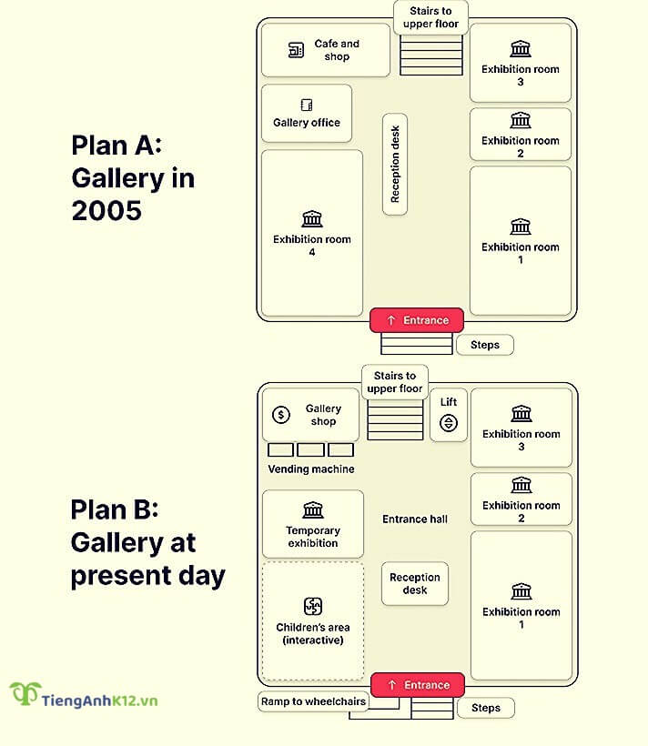 Đề bài: Plan A below shows the ground floor of a particular art gallery in 2005. Plan B shows the same area in the present day.