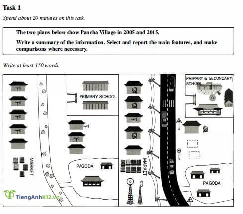 Đề bài: The two plans show Pancha village in 2005 and 2015. Write a summary of the information. Select and report the main features, and make comparisons when necessary.