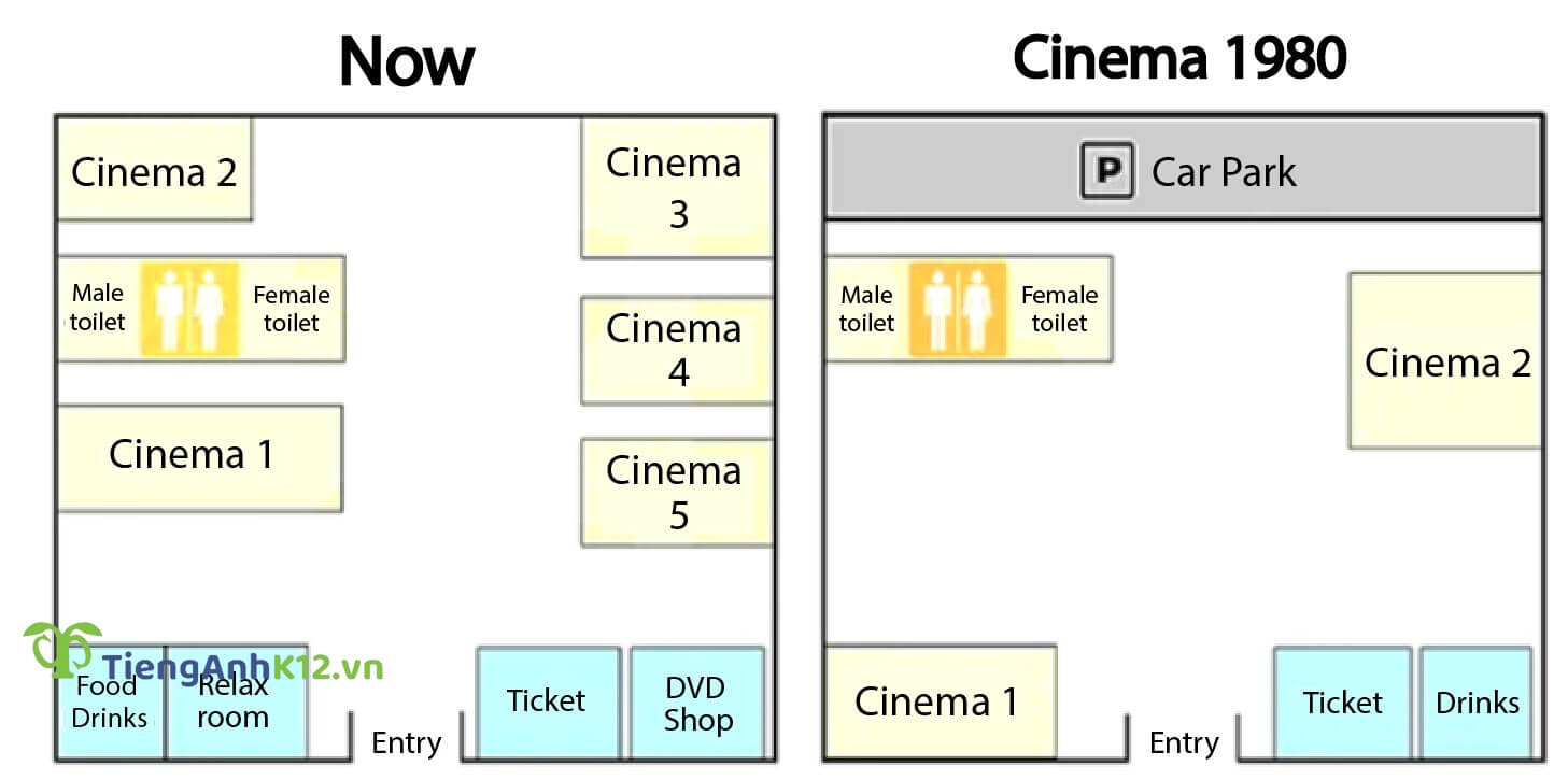 Đề bài: The pictures show the layout of a cinema in 1980 and the same cinema now.