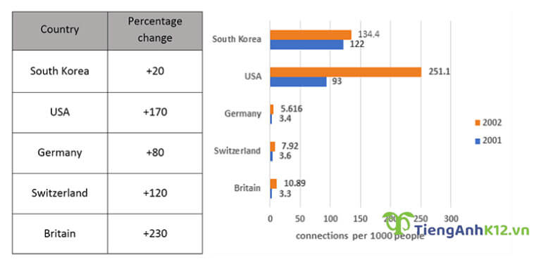Đề bài: The chart below gives information about the high-speed continuous internet connection of households in five countries in 2001 and 2002