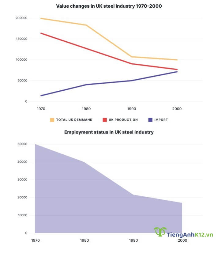 Đề bài: The graphs show the changes in the UK industry steel between 1970 and 2000. (đơn vị milliontonnes vs thousand)