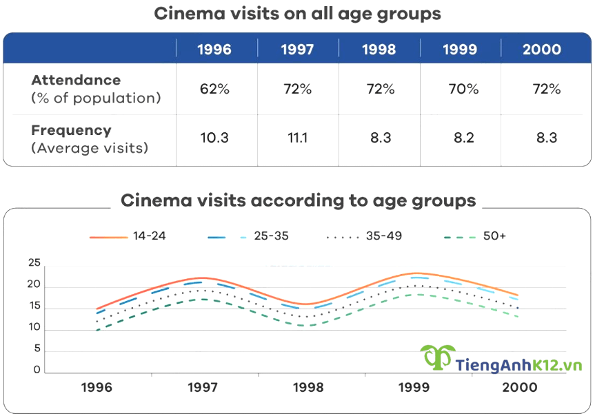 Đề bài: The graphs below show the cinema attendance in Australia and the average cinema visits by different age groups from 1996 to 2000.