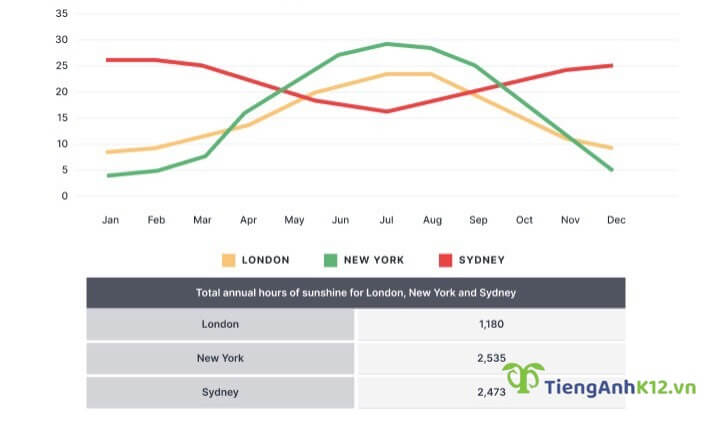 Đề bài: The graph and table below show the average monthly temperatures and the average number of hours of sunshine per year in three major cities.