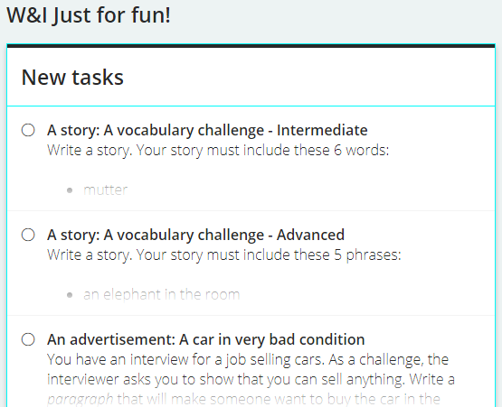 - Ngoài ra, còn có mục Just for fun! gồm các đề bài để bạn luyện viết vui, có thể phân chia trình độ hoặc không.