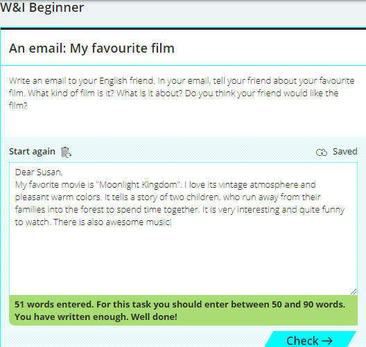 Sau khi viết bài xong, sẽ có phần nhận xét, bài viết của bạn gồm bao nhiêu từ. Như vậy, với đề bài thuộc trình độ này, số lượng từ như vậy đã đủ hay chưa.