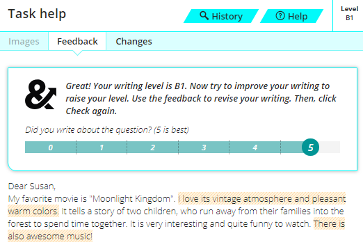 - Bạn nộp bài lên hệ thống và chờ để nhận phản hồi, những lỗi sai, gợi ý cách chữa lỗi… Trang web cũng sẽ chấm điểm bài viết của bạn theo thang điểm CEFR (khung tham chiếu trình độ ngôn ngữ chung của Châu Âu), với mức thấp nhất A1 và cao nhất là C2.